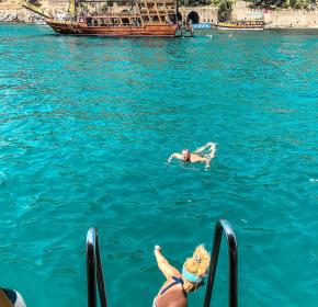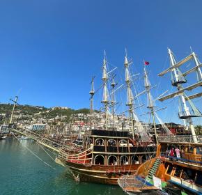 Приглашаем вас на борт пиратской яхты. Мы отправляемся в открытое море. Вы увидите Пещеру Влюбленных и Красную Башню, встретите дельфинов и пообедаете на борту яхты. Вас ждут наслаждения — яркое солнце, красивые виды и купание в открытом море.