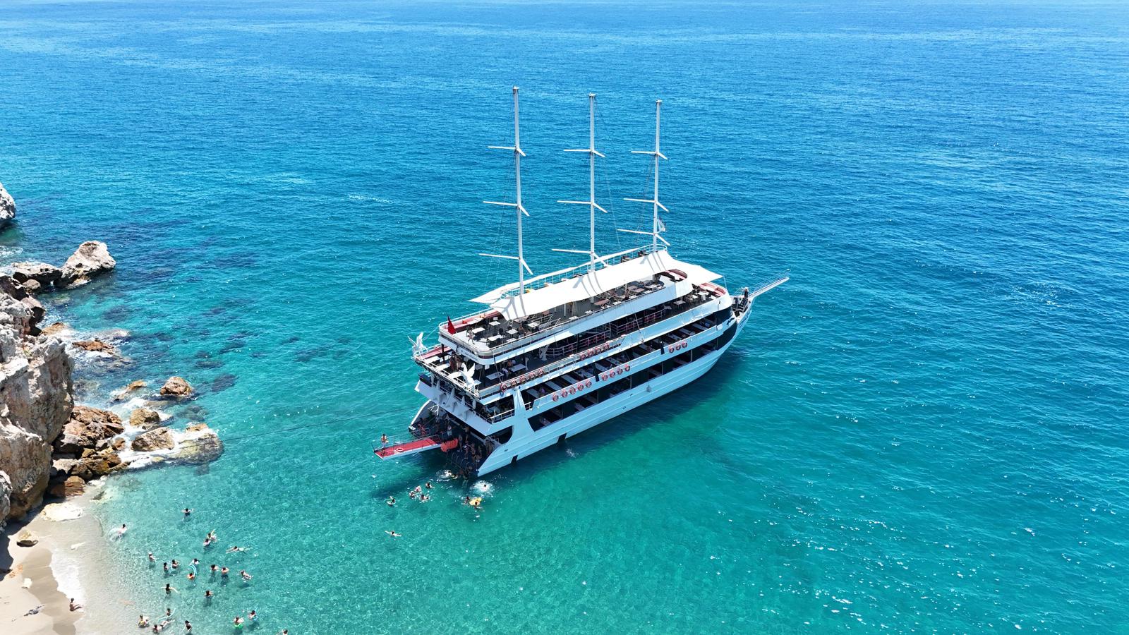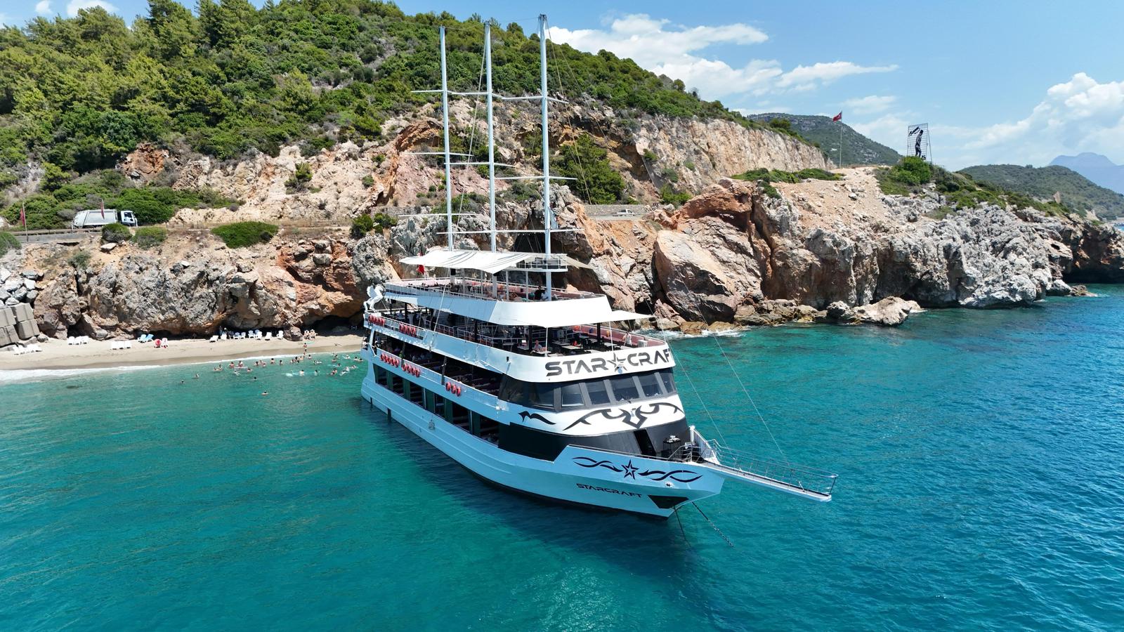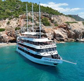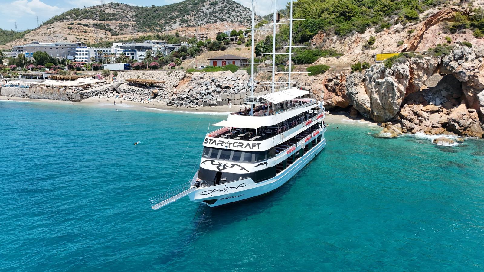Отправьтесь в морское путешествие на одной из самых больших яхт побережья — роскошной Starcraft. Вас ждёт музыка, отдых на палубе, живописные виды Аланьи и освежающие купания. Маршрут проходит мимо знаменитых достопримечательностей, включая Красную башню и пляж Клеопатры.